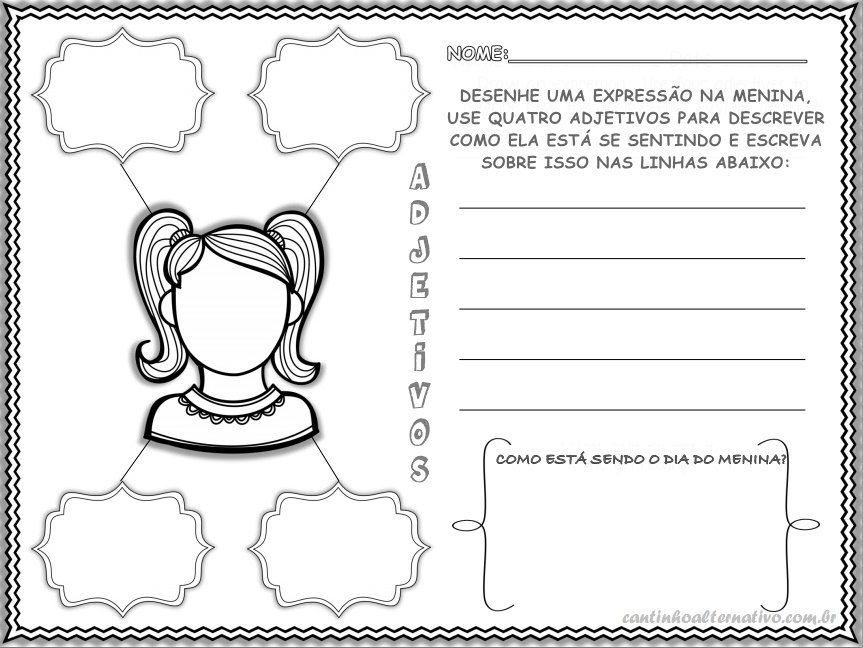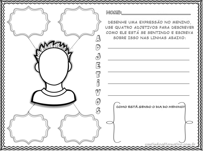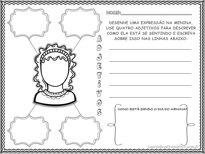 Acabei de editar estas atividades onde as crianças deverão preencher com adjetivos de acordo com o desenho. Elas deverão também descrever sobre o que estão vendo.