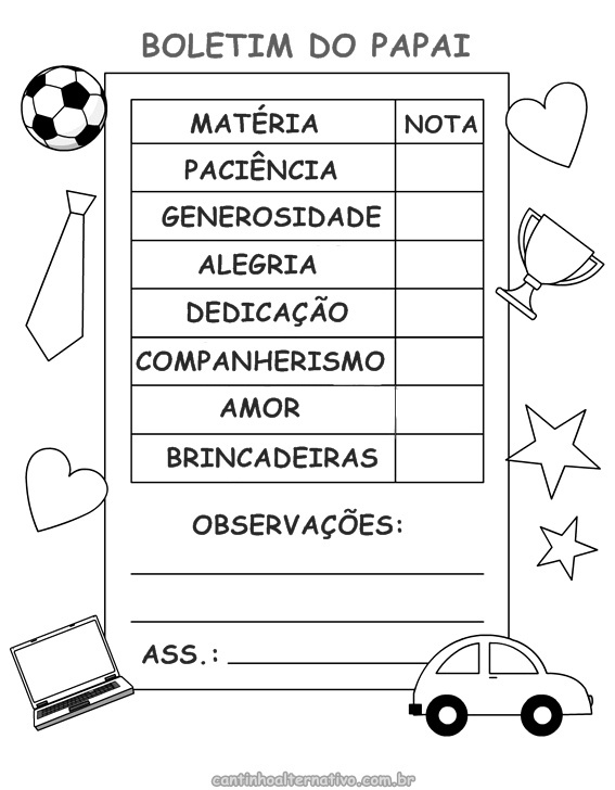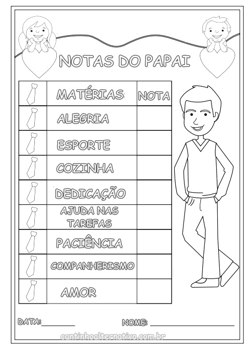 Oi amigos. Essa atividade para imprimir é uma espécie de boletim para dar notas para o papai. Nela estão listados alguns requisitos onde a criança irá dar uma nota de 0 a 10.