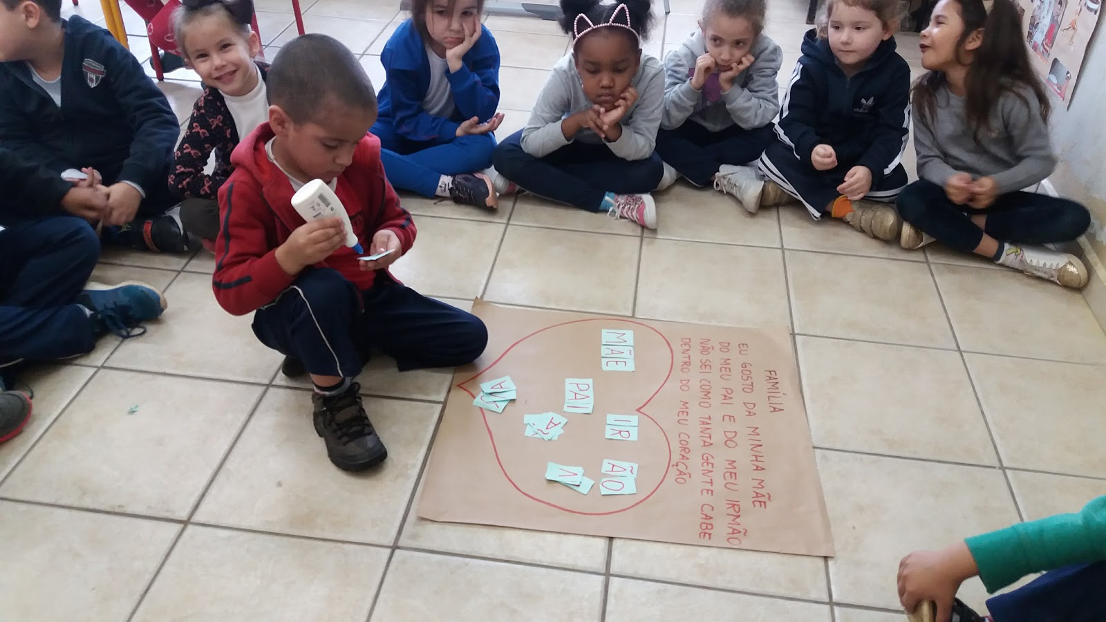 Escrevi também o poema no papel pardo, escrevi as palavras: PAI, MÃE, IRMÃO, IRMÃ, AVÓ E AVÔ no quadro e as crianças tiveram que formar essas palavrinhas e colar no “coração” do papel pardo.