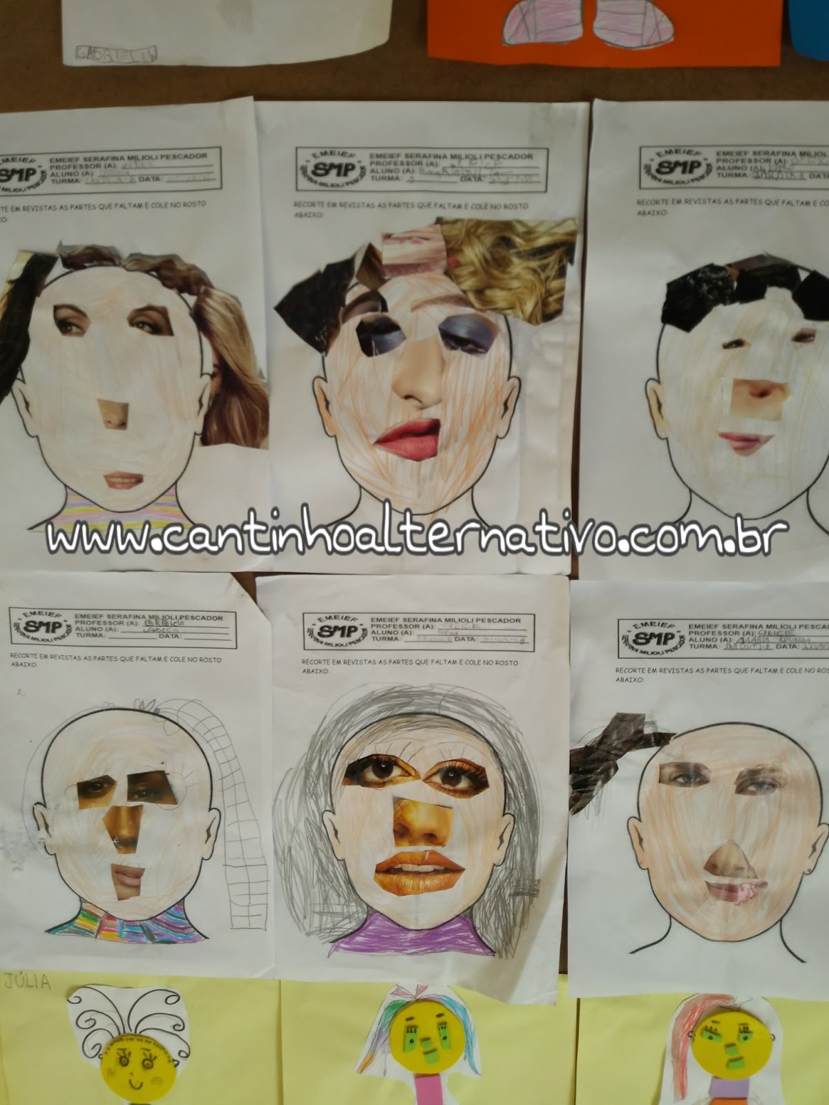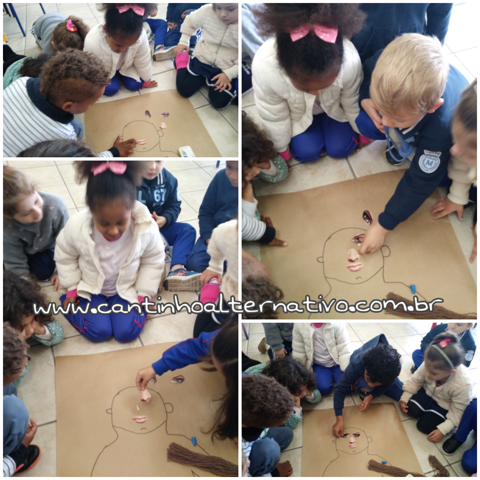 Dei o contorno do rosto para as crianças pintarem, depois dei revistas e pedi para elas recortarem as partes do rosto que faltavam e colarem na atividade.