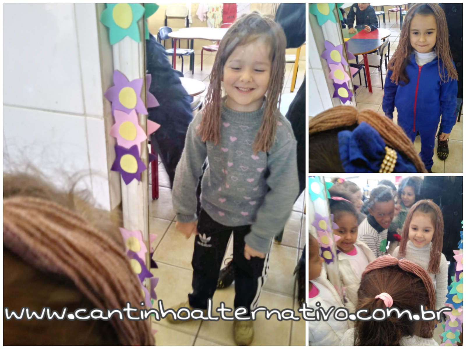 Brincado no espelho com o “cabelo” que colamos na atividade.