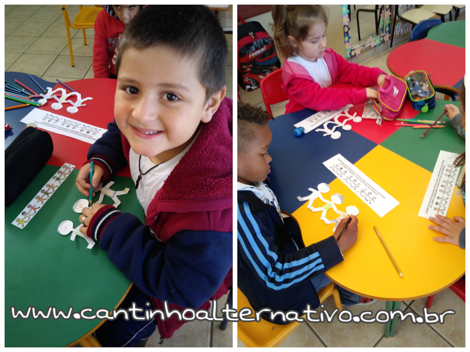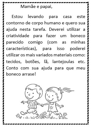 Li um livrinho que falava sobre amizade, depois dei a atividade abaixo e pedi para as crianças se desenharem no boneco do meio e um amigo em cada lado. Nesta atividade entreguei os boneco já recortados, pois havia partes muito finas que poderiam rasgar, mas entreguei ainda dobrados para as crianças abrirem.