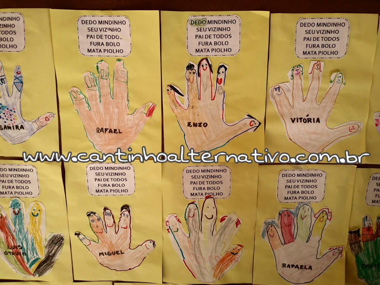 Na atividade abaixo, depois de recitarmos a parlenda várias vezes, dei metade de uma folha de papel ofício para as crianças fazerem co contorno de suas mãos (algumas eu tive que ajudar a contornar). Pedi para elas desenharem um rostinho em cada dedinho e recortarem, entreguei também a parlenda por escrito para as crianças circularem a palavra DEDO.