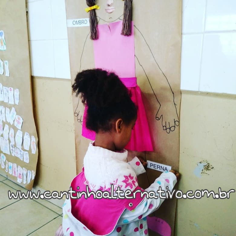Uma das atividades que realizamos foi a co contorno do corpo. Pedi para uma criança deitar sobre o papel pardo e fazer seu contorno, colamos as partes do rosto com recortes de revistas que elas mesmo procuraram e recortaram, fizemos roupinha para vestir e colamos etiquetas com o mome de algumas partes do corpo.