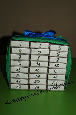 Tudo que você vai precisar é de 24 caixas de fósforo vazias, cola, lápis de cor, fita e surpresinhas para colocar em cada “gavetinha”.