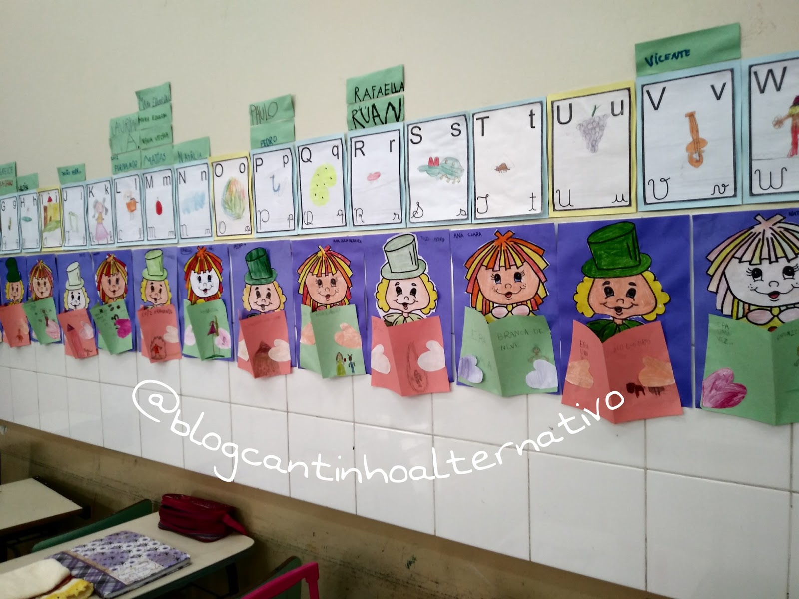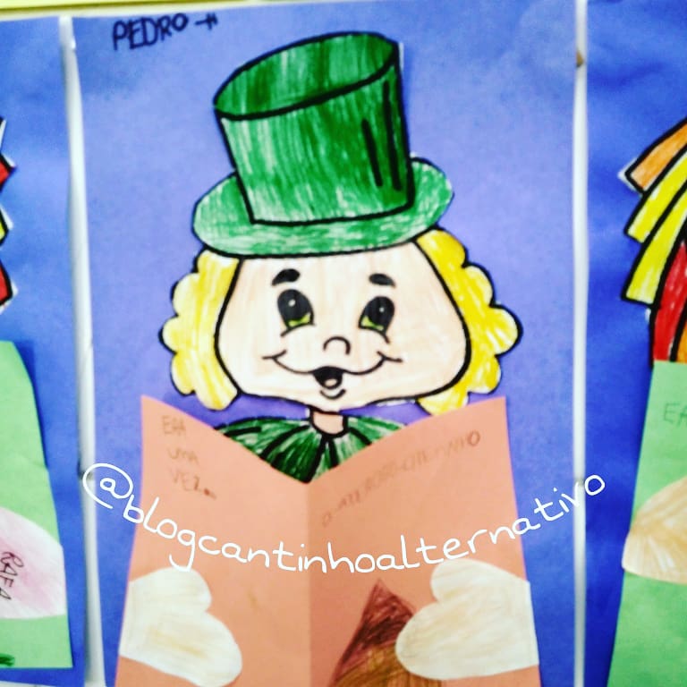 As crianças pintaram estes dois personagens recortaram e colaram num papel tamanho ofício colorido, depois em um retângulo de papel colorido, dobraram-no meio e fizeram uma espécie de capa de livro, de um lado escreveram ERA UMA VEZ…, e do outro desenharam e escreveram o título de seu livro preferido.