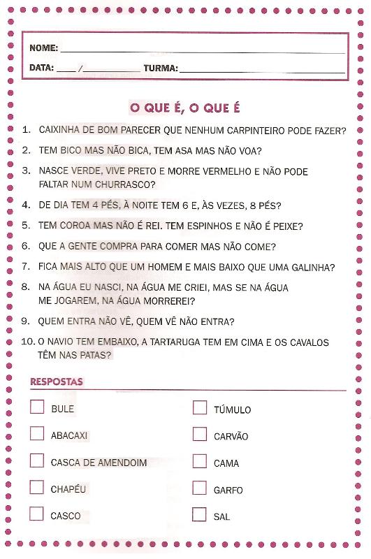 Olá amigos tudo certinho? As adivinhas são uma diversão só para as crianças. Então que tal trabalhar o folclore com as adivinhas? Segue algumas atividades com adivinhas para imprimir.