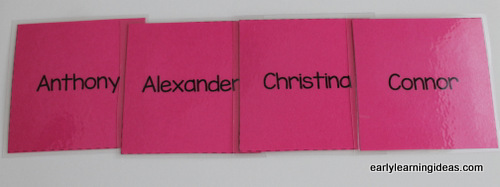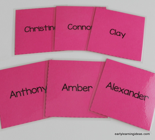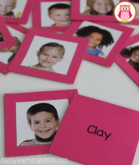 Imprima a foto de cada criança e seu nome, cole em quadrados de papel cartão colorido e plastifique-os.