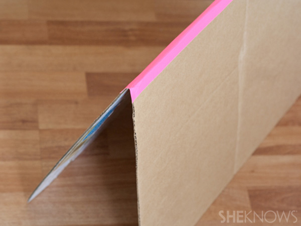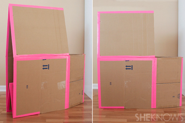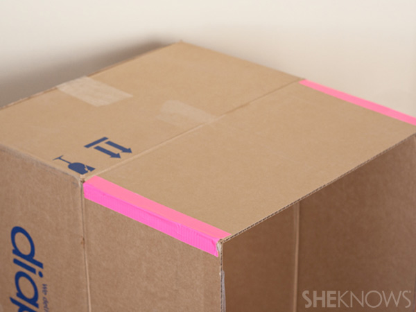 Com os cortes, a caixa irá facilmente cair plana. Certifique-se de que as abas para trás e inferior dobrar para fora. Com a caixa de cartão plana, passe fita nas bordas das abas cortadas. Em seguida, abra a casa e reforce com fita dos dois lados.