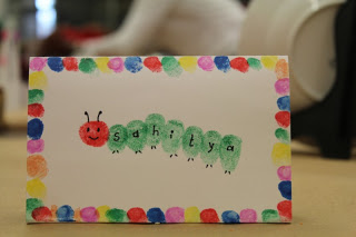 Olá queridos amigos, a dica de hoje é muito original. Consiste em cada criança confeccionar sua própria plaquinha de mesa ou crachá de identificação do nome com a impressão do polegar em guache formando linda lagarta.