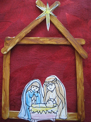 Um trabalhinho bem simples e bonito é o presépio feito com palitos de picolé, cola e desenho da família de Jesus.