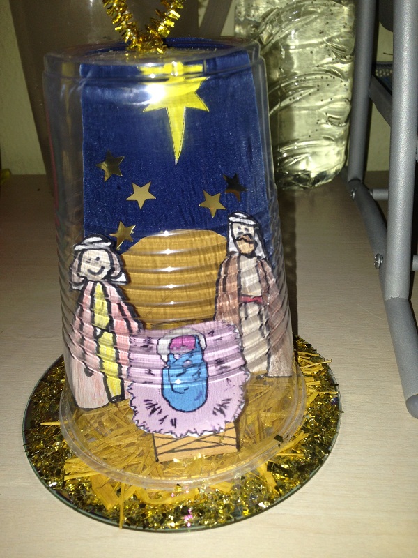 Vejam só que graça este presépio para fazer com copinho descartável transparente e CD usado: