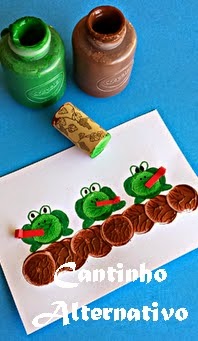 Utilizando rolha de cortiça, guache e canetinha colorida faça simpáticos sapinhos como estes: