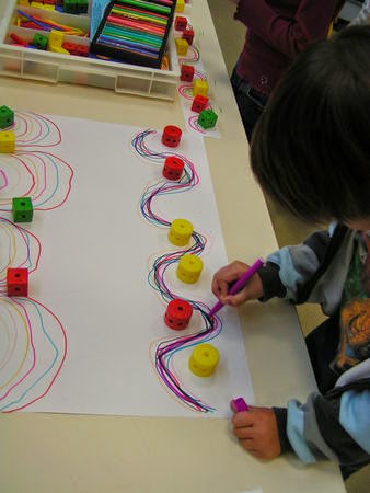 Depois trabalhe a coordenação motora fina colocando pecinhas como obstáculos sobre uma folha branca para a criança traçar o percurso em zig-zag.