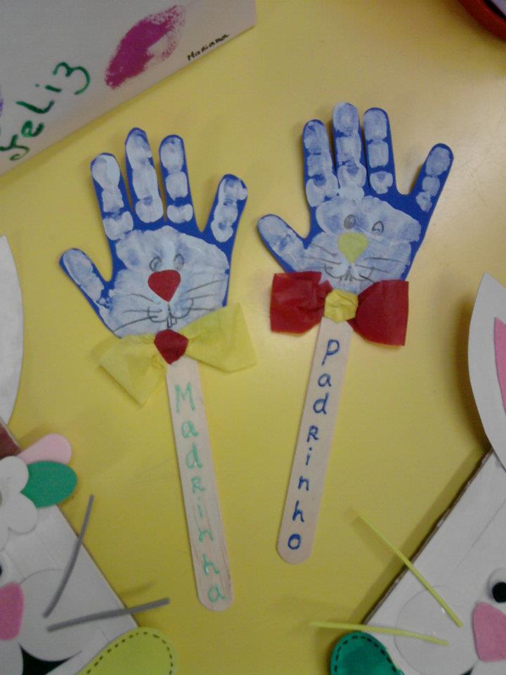 Nesta outra atividade é confeccionado um coelho com a impressão da palma da mão em guache, desenhe a carrinha do coelho cole um palito de picolé e enfeite de seu jeito (eu, na hora de carimbar a mão juntaria dois dedinhos para cada orelha).
