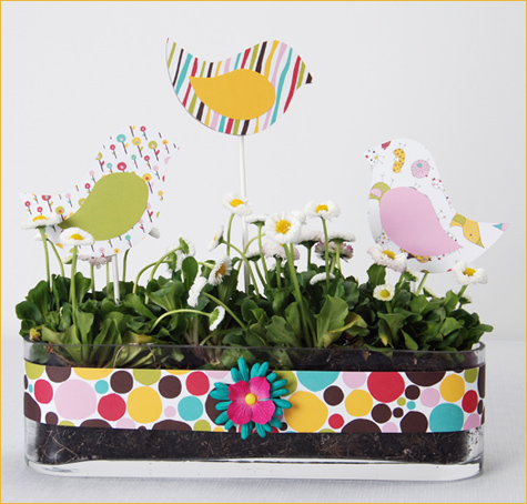 Para fazer estes vasinhos centro de mesa, basta confeccionar passarinhos como os da imagem, em papel colorido e firme (faça duplicado para poder colar o palito de churrasco).